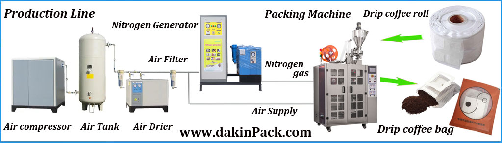 1. Tropfkaffeebeutel-Produktionslinie wie folgt: Kaffeeröstmaschine + Kaffeemahlmaschine + Ultraschall kaffeebeutel verpackungsmaschine + Luftkompressor + Stickstoffgasgenerator.